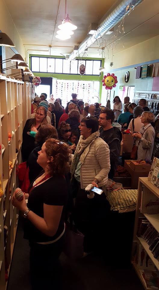 Friends of The Naked Sheep Knit Shop gathered at Atomic Pizza on Sunday afternoon (April 9), paraded down the street to the shop at about 2pm with balloons, flowers, treats, and lots of hugs; and completely surprised me with a Surprise Flash Mob Shopping Spree! Big thanks to Jenna from Atomic Pizza for organizing this amazing event, to Kristin (still my head purl girl) for running the cash register so I could enjoy the afternoon, and to all my lovely customers, family, and neighbor businesses that participated in the